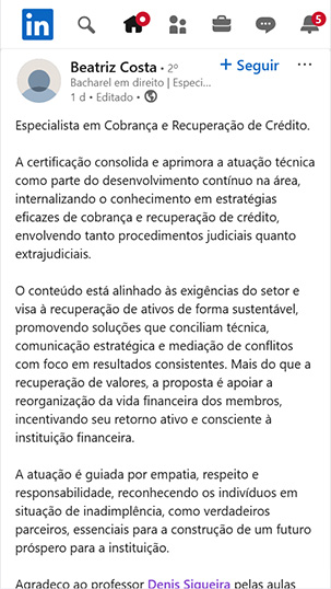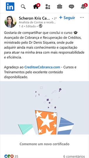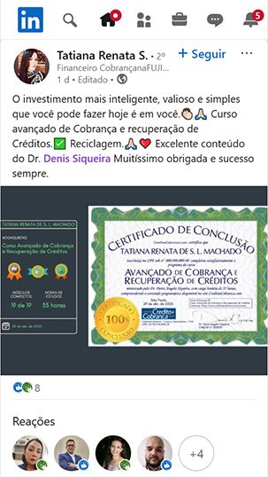 Gostaria de compartilhar que conclui o curso 🎓 Avançado de Cobrança e Recuperação de Créditos, ministrado pelo Dr Denis Siqueira, onde pude adquirir ainda mais conhecimento e capacitação para atuar na minha área com mais responsabilidade e eficiência.
