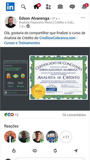 Olá, gostaria de compartilhar que finalizei o curso de Analista de Crédito do CreditoeCobranca.com - Cursos e Treinamentos