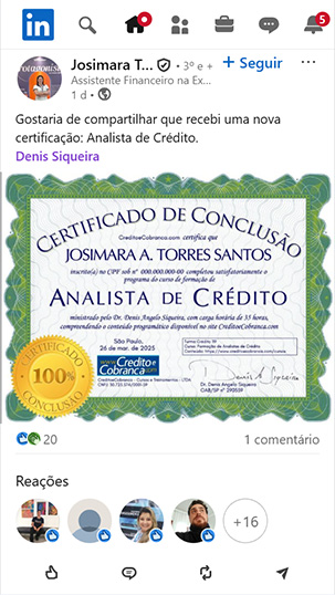 Gostaria de compartilhar que recebi uma nova certificação: Analista de Crédito.