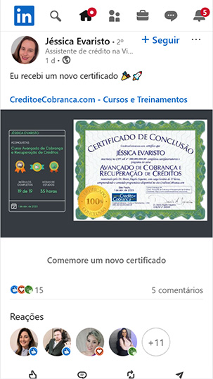Eu tinha pouco conhecimento antes do curso. Aprendi muito com o curso Análise de crédito, Meu próximo curso será Recuperação de créditos.