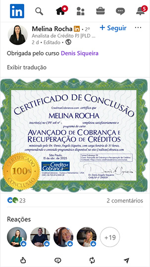 Quero agradecer a equipe ao preletor por todo o conhecimento e dedicação, pois trouxe mais informação e clareza no conteúdo. Trouxe consigo informações adicionais importantes para que eu possa aplicar nas metodologias do meu trabalho e ajustes em documentos de fundamentos tantos de crédito quanto de cobranças.