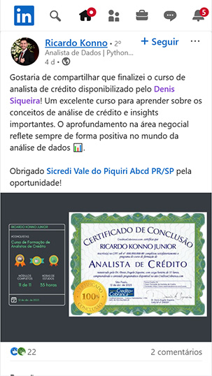Gostaria de compartilhar que finalizei o curso de analista de crédito disponibilizado pelo Denis Siqueira ! Um excelente curso para aprender sobre os conceitos de análise de crédito e insights importantes. O aprofundamento na área negocial reflete sempre de forma positiva no mundo da análise de dados 📊.